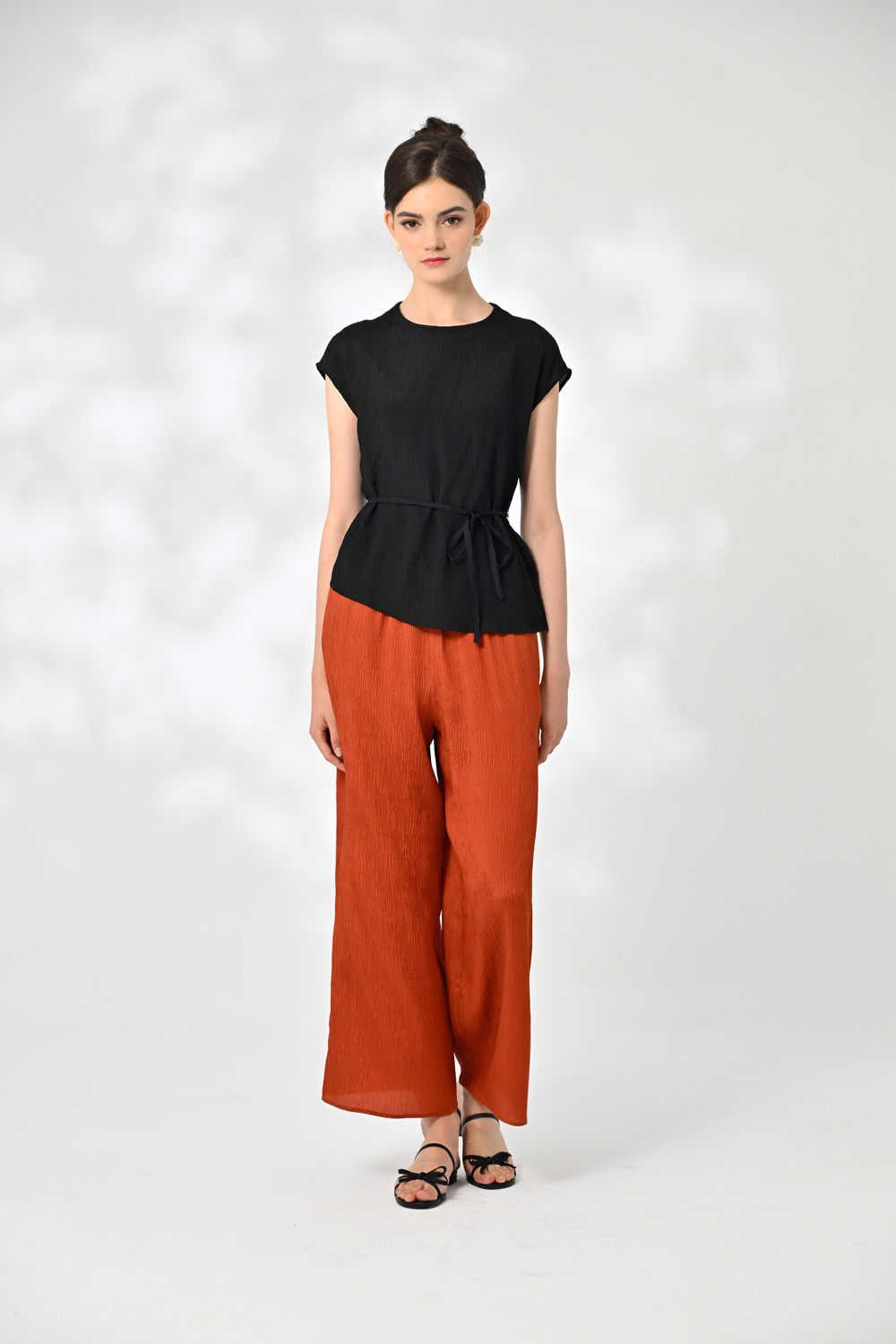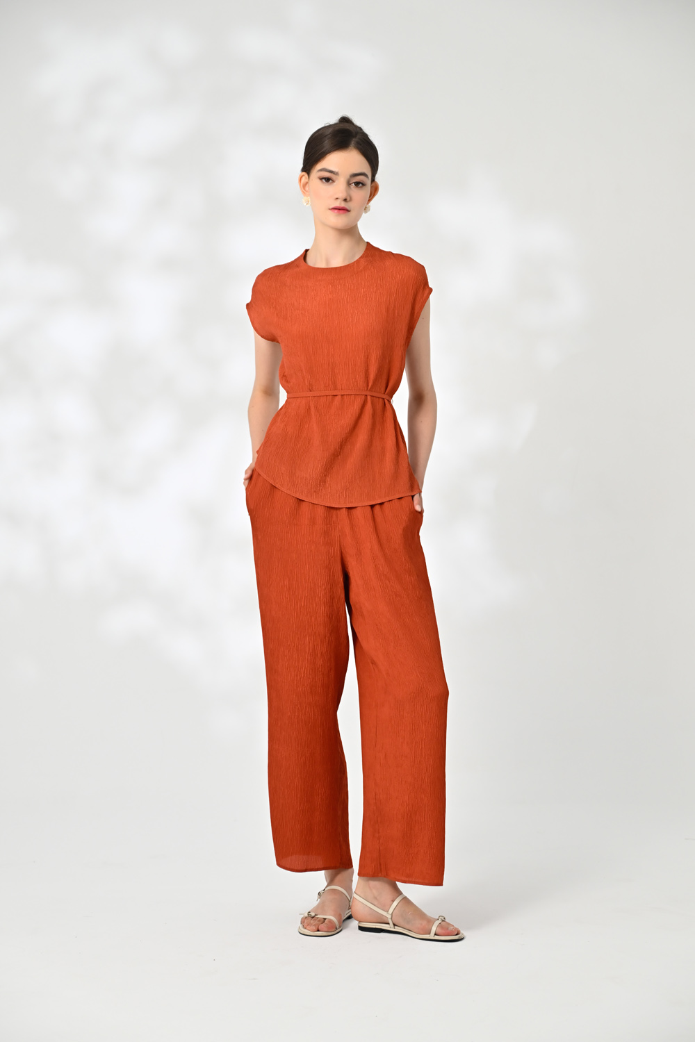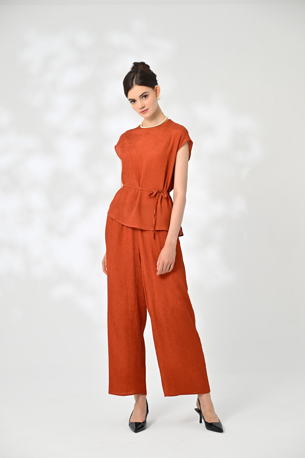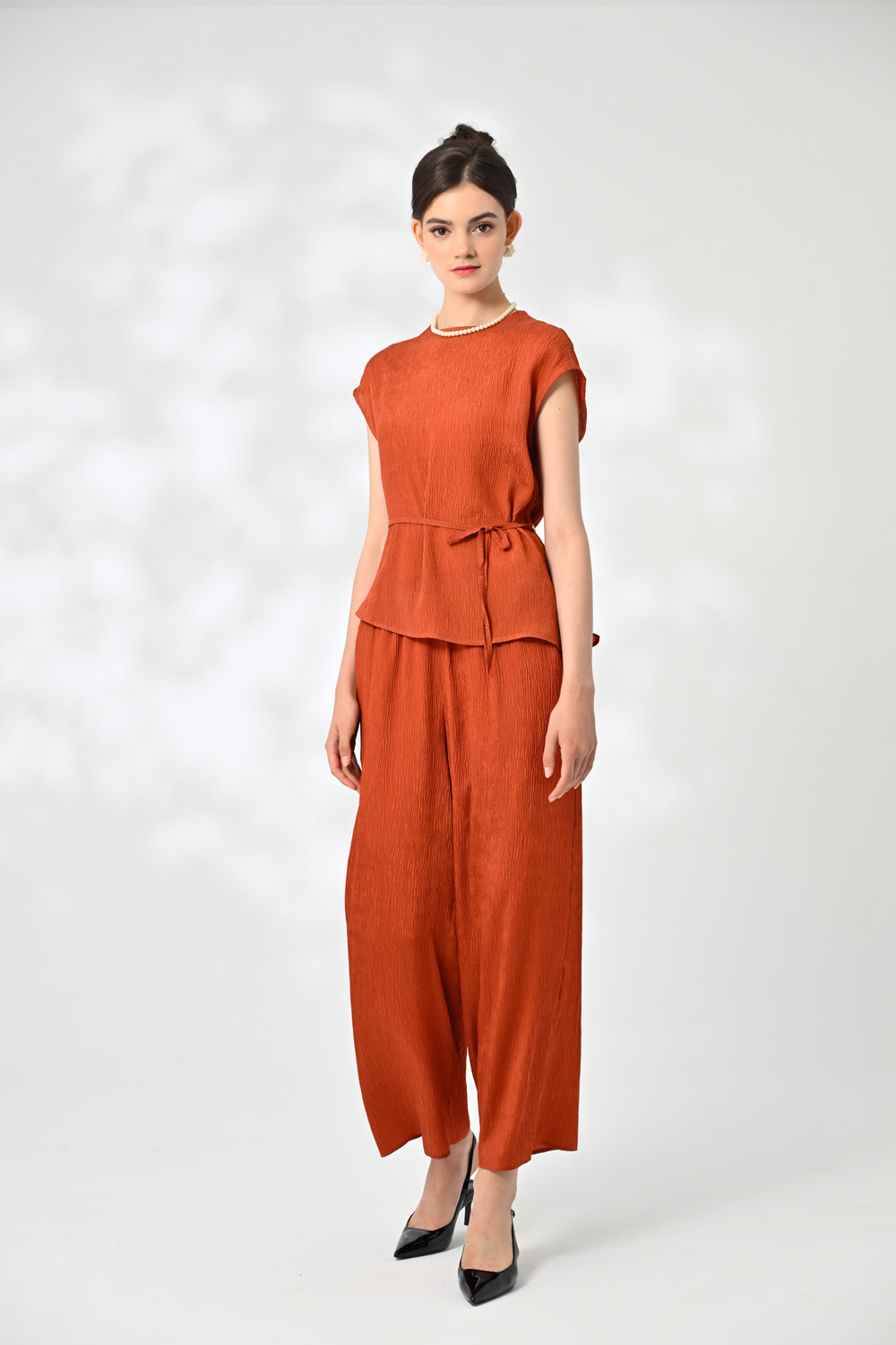 御絹坊質感尊榮褶縐蠶絲鬆緊長褲-6758(紅柿色)